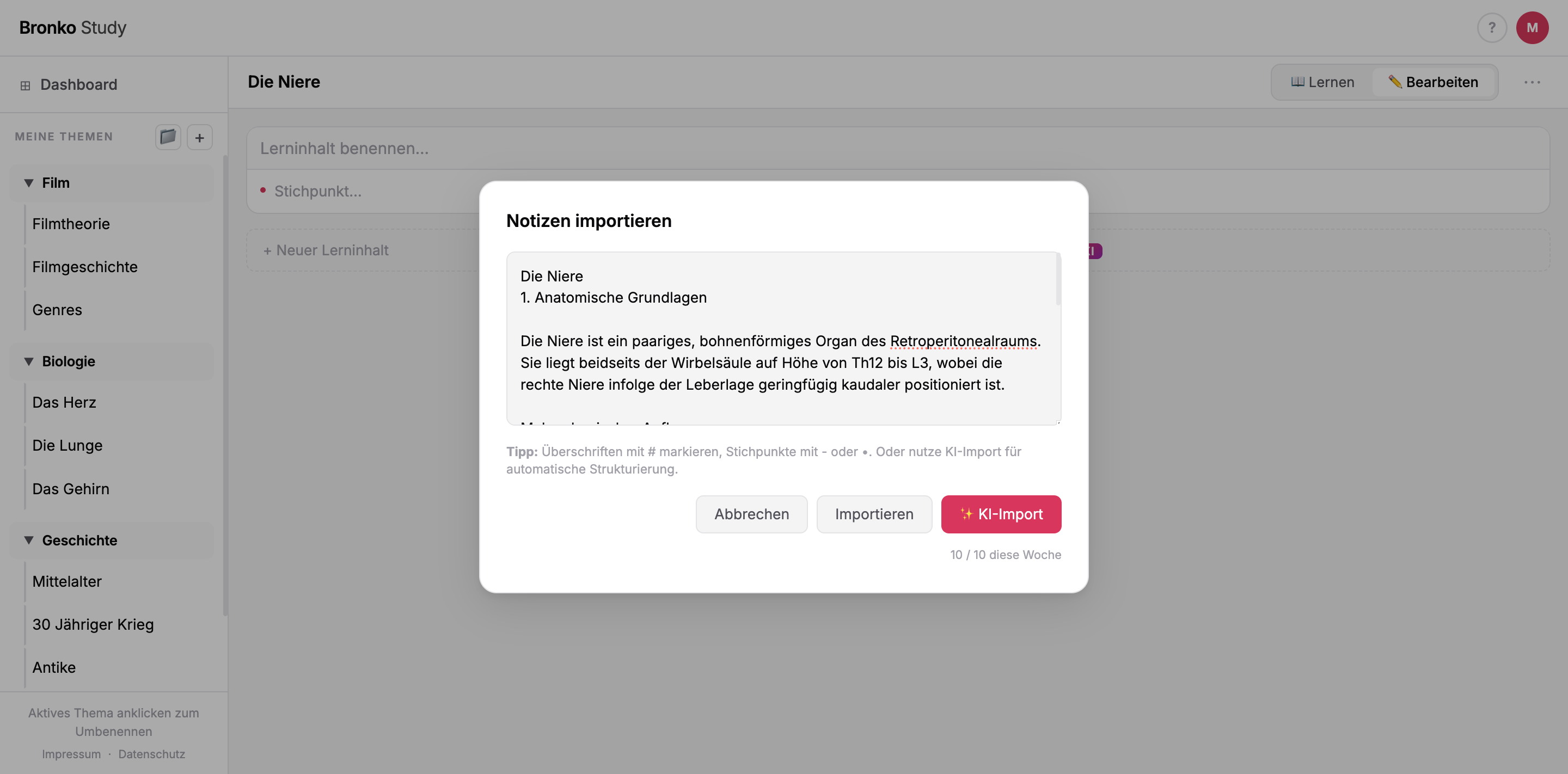 Du hast eine Zusammenfassung, Mitschrift oder ein PDF — und keine Lust, alles manuell einzutippen. Einfach reinkopieren oder hochladen. Bronko Study strukturiert den Inhalt automatisch in Themen, Abschnitte und Stichpunkte, die du sofort lernen kannst.
