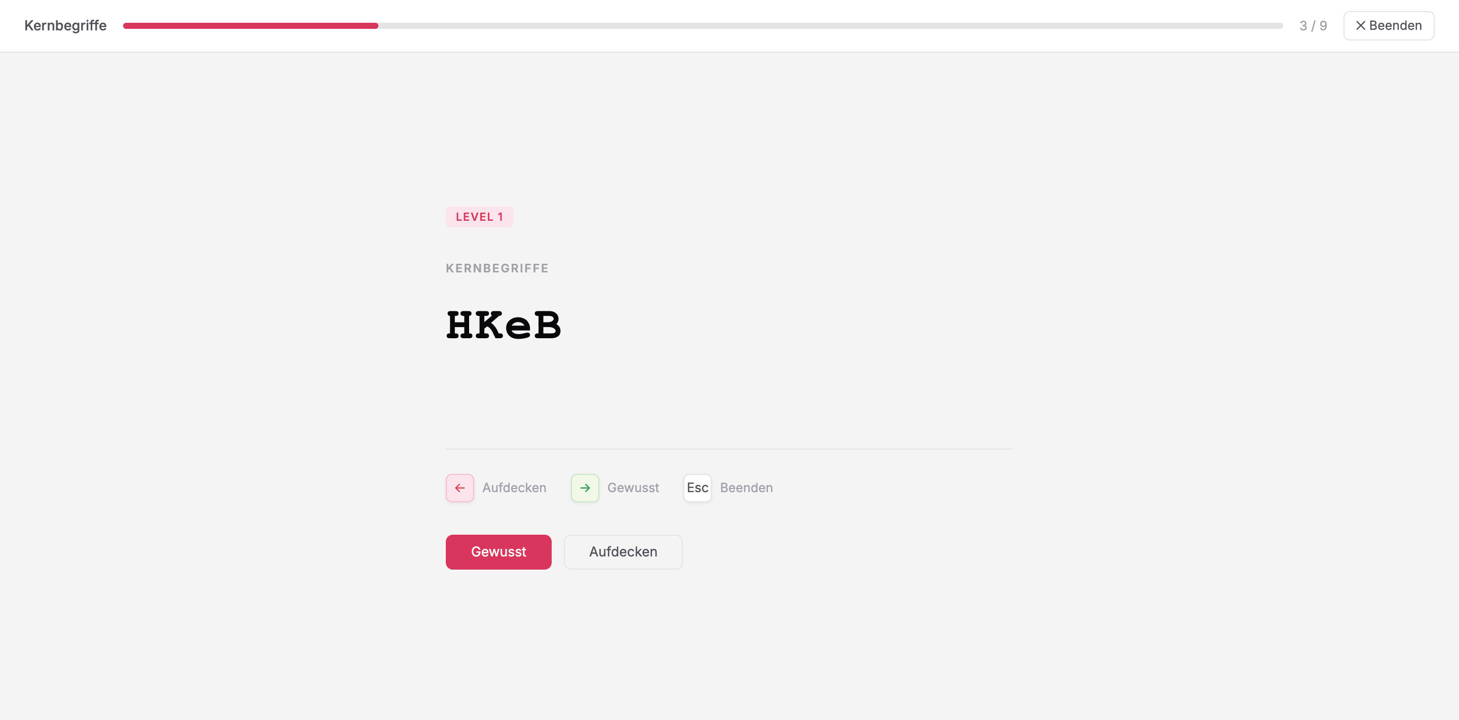 Du siehst nur die Anfangsbuchstaben jedes Stichpunkts. Kein Text, keine Vorlage — du musst den Satz aus dem Kopf rekonstruieren. Sobald du einen Stichpunkt dreimal fehlerfrei aus dem Kopf rekonstruiert hast, gilt er für diese Stufe als gelernt.