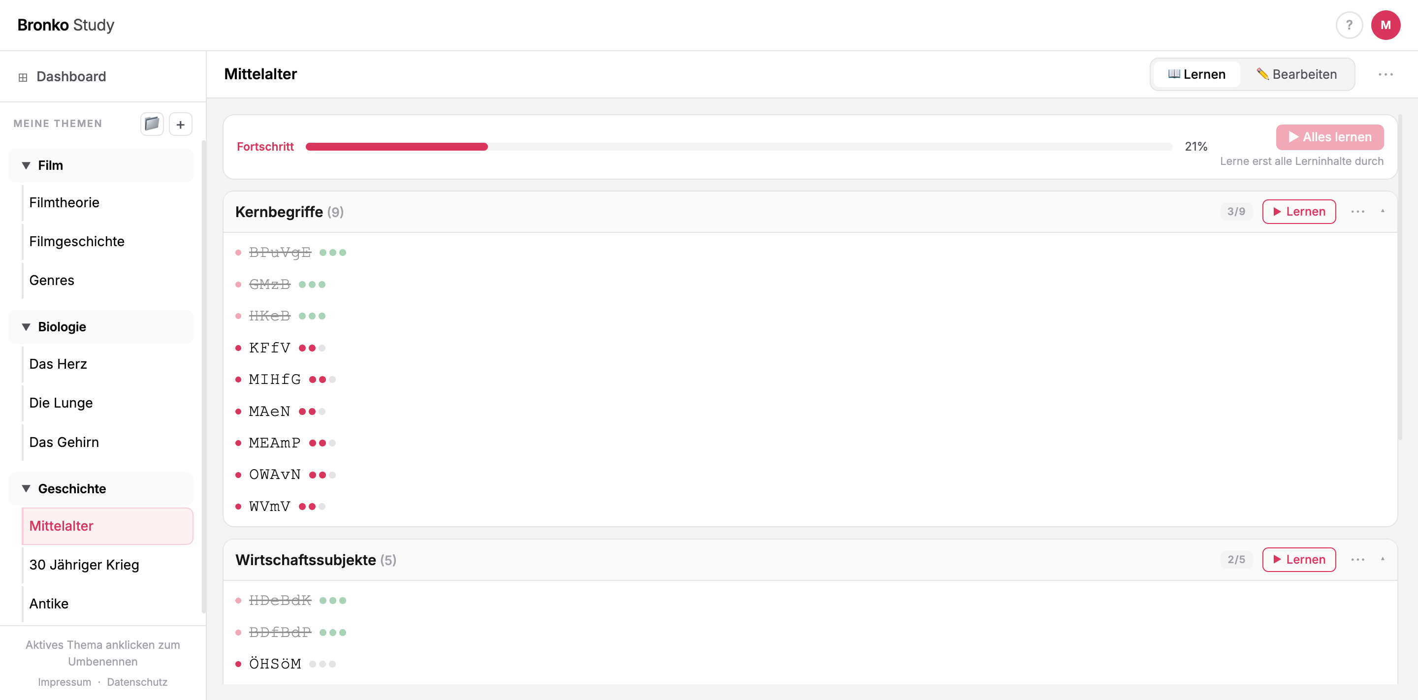 Du legst Themen an und unterteilst sie in Lernabschnitte. Inhalte kannst du jederzeit ändern — der Fortschritt passt sich automatisch an.